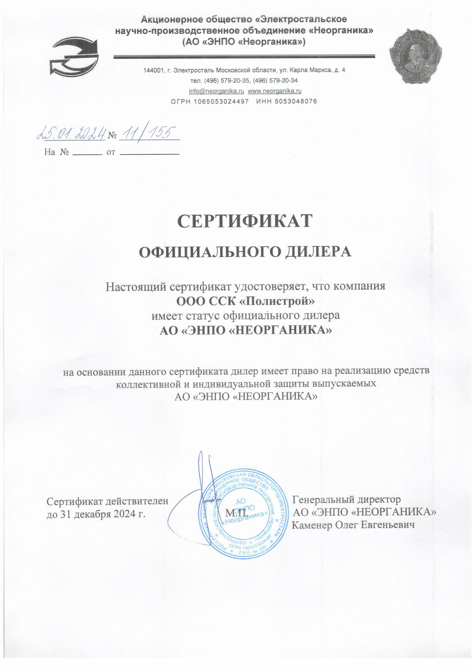 ООО ССК «Полистрой» г. Москва является официальным дилером по реализации продукции средств коллективной защиты от ведущих Российских производителей, АО «ЭНПО «Неорганика» (г.Электросталь), АО «Корпорация «Росхимзащита» (г. Тамбов)